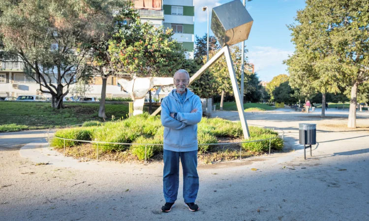 Ferran Soriano, amb la seva escultura al Parc de Bellvitge de l’Hospitalet. Foto: Joanna Chichelnitzky